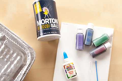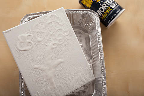 Put the canvas on a rimmed cookie sheet. Pour salt onto the glue. Shake off the excess salt.